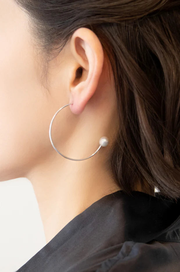 パール付きフープを最大限生かすなら、やはりショートヘアの方におススメ。正面からみれば、飾りなく見えるフープも、少し横をむけばパールが艶めきます。